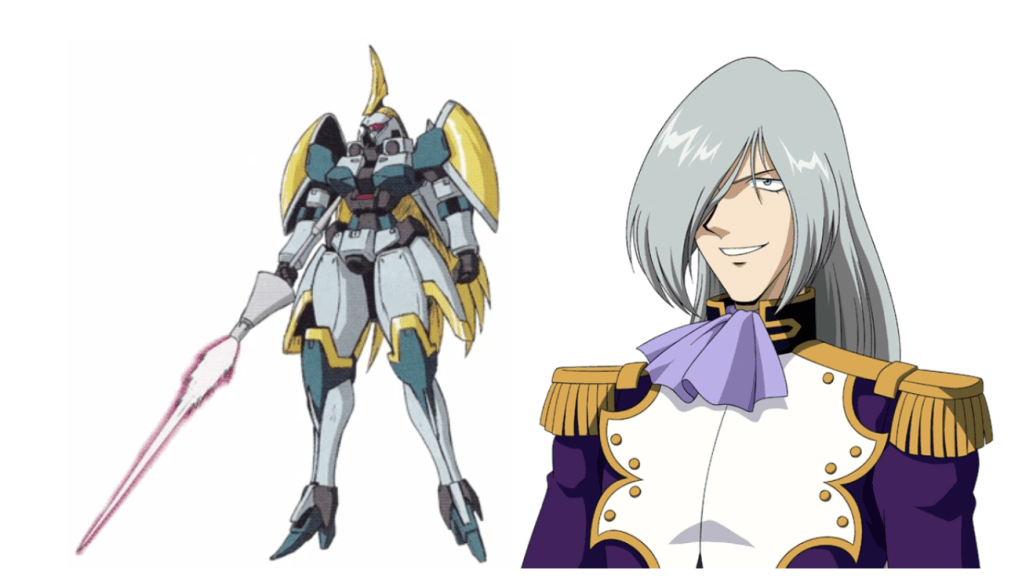 Piloting the deceptively feminine OZ-06MS-SR2 “Leo R” is Kratz Silvy. The Leo R has the arms and legs of the Aries and a curvaceous design so as to emphasize high speed and mobility.